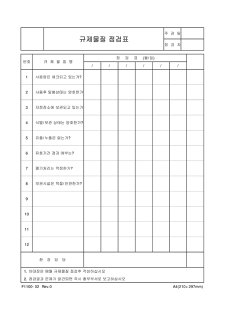 규제물질명,점검표로 구성된 규제물질 점검표입니다.