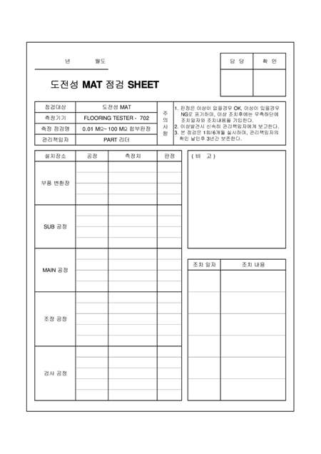 설치장소,공정,측정치,판정을 기록하는 도전성 MAT 점검 SHEET입니다.