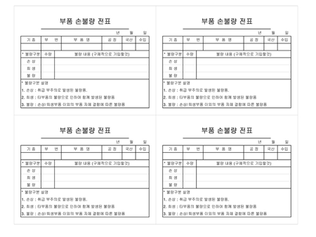 기종,부번,부품명,고정,불량구분,수량,불량내용을 기록하는 부품 손불량 전표입니다.