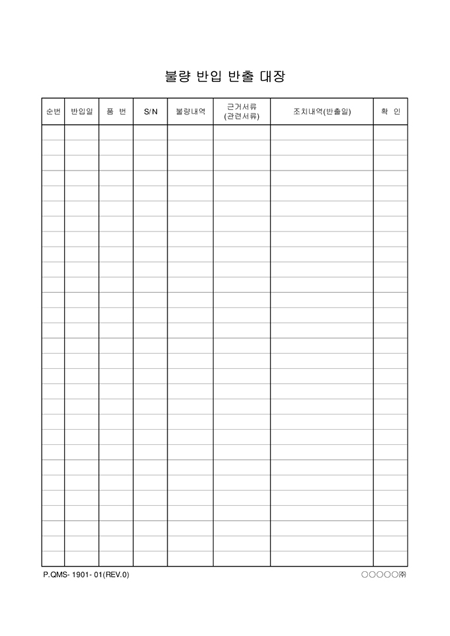 순번,반입일,품번,S/N,불량내역,근거서류,조치내역을 기록하는 불량 반입 반출대장입니다.
