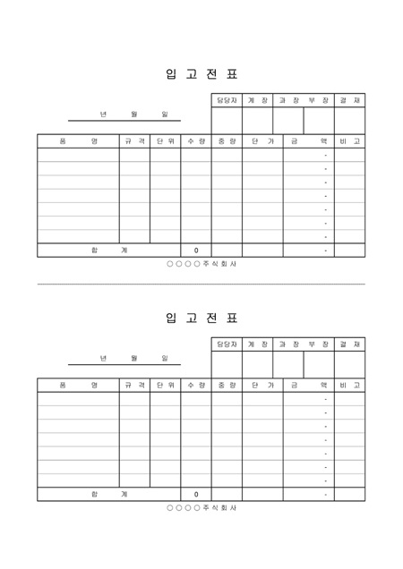 품명,규격,단위,수량,중량,단가,금액을 기록하는 입고전표입니다.