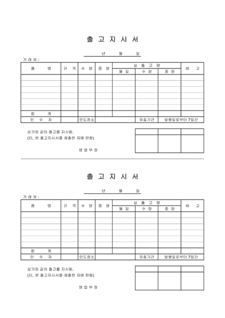 제품의 출고를 지시할 때 사용하는 양식으로 품명, 규격, 수량, 중량, 실출고량등을 기재합니다.