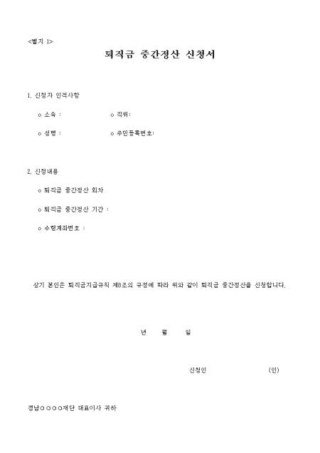 인적사항. 신청내용을 기재하여 퇴직금에 대한 중간정산을 신청할 때 사용하는 양식입니다.
