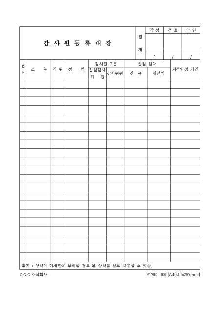 감사원의 소속,직위,성명,감사원 구분,선임일자,자격인정기간을 기재하는 감사원등록대장입니다.