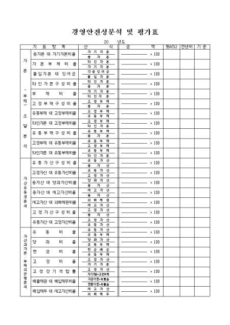 자본(부채)조달분석,자산유동성분석,자산과자본 및 부채의 균형분석을 기록하는 경영안전성분석 및 평가표입니다.