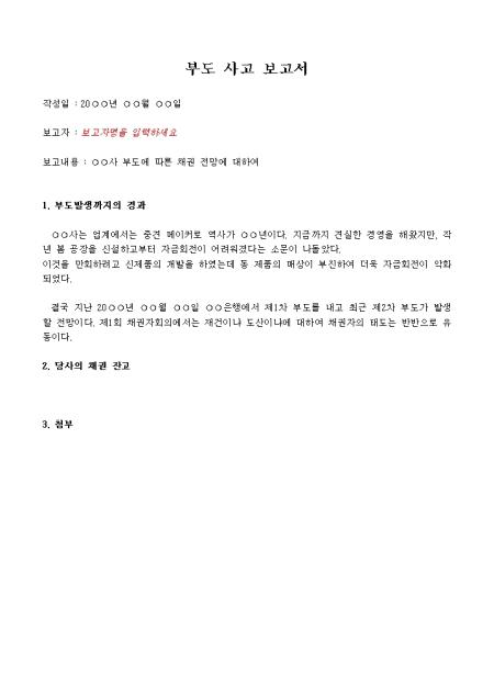부도발생까지의 경과,당사의 채권잔고를 기록하는 부도사고 보고서입니다.