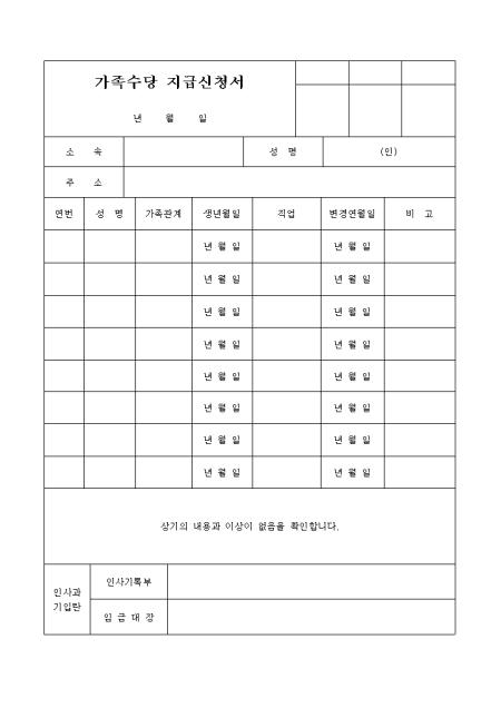 회사에 가족수당을 신청할 때 사용하는 양식입니다.