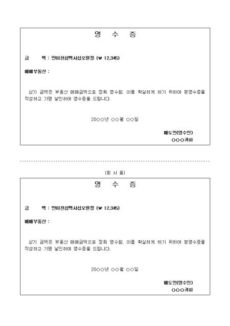 부동산 매매금액을 영수 후 증명할 때 사용하는 양식입니다.