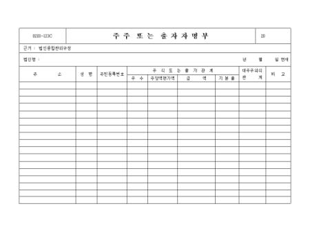 주주나 출자자의 주소,성명,주민번호, 주식 또는 줄자관계,대주주와의 관계를 기록하는 양식입니다.