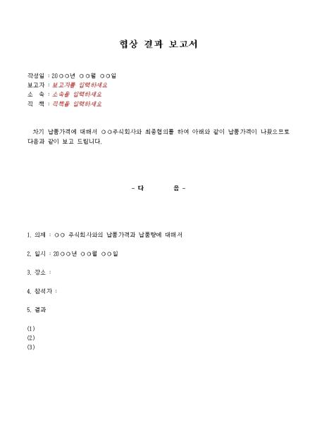 제품 납품가격에 대한 협상 결과를 보고하는 양식입니다.