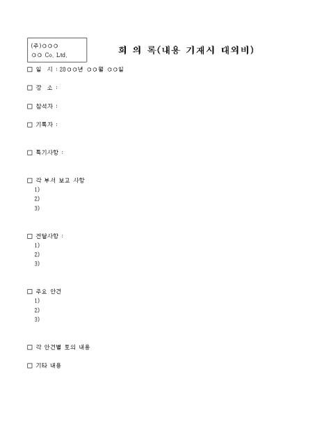일시,장소,참석자,기록자,특기사항,각 부서 보고사항,전달사항,주요안건,각 안건별 토의내용을 기록하는 회의록 양식입니다.