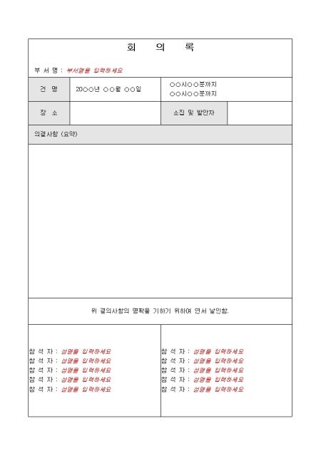회의 참석자의 날인을 하는 양식입니다.