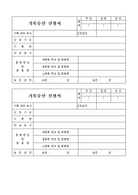기록관리부서,신청사유,기록명,작성부서,분류번호 및 분류명,보존년한을기록하는 기록승인 신청서입니다.
