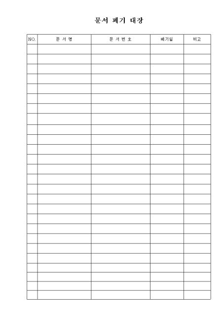 문서명,문서번호,폐기일,비고란으로 구성된 문서폐기대장입니다.
