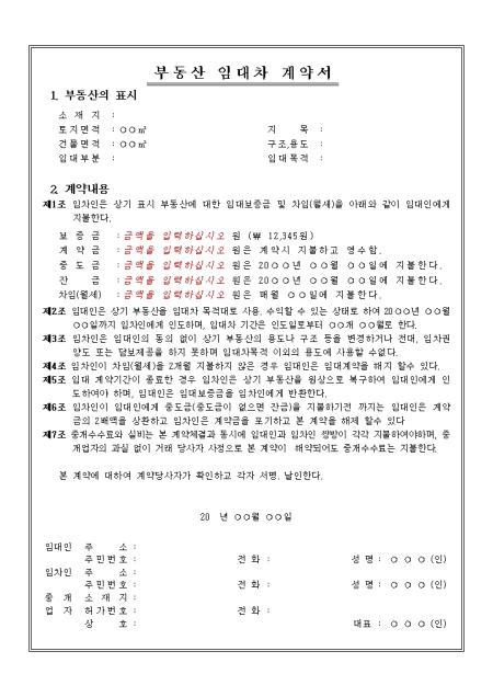 소재지, 토지면적, 건물면적, 임대부분등 상세하게 부동산을 표시할수 있고 계약내용 조항들과 임대인, 임차인, 중개업자의 개인정보사항을 기재할 수 있도록 구성되어 있습니다.