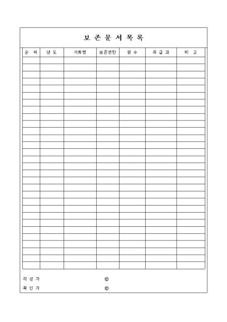 사내 보존 문서현황을 기재하는 보존문서목록표양식입니다.