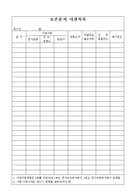 사내 보관된 문서의 이관목록을 기재하도록 되어 있는 양식입니다.