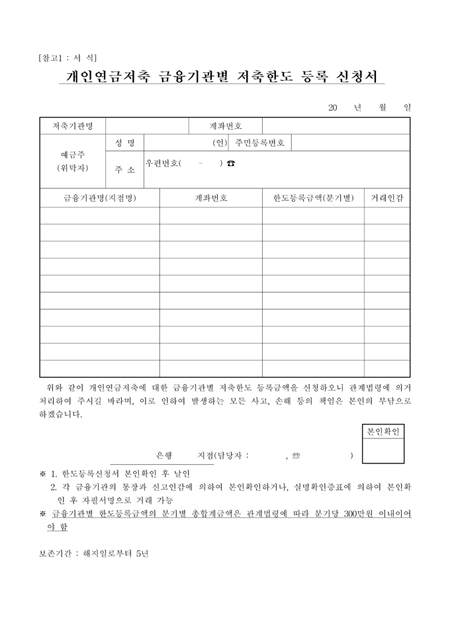 금융기관별 개인연금저축 한도 등록금액을 신청할때 사용하는 양식입니다.