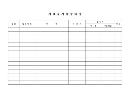일자,발송번호,제목,수신처,발송자를 기록하는 사내문서발송대장입니다.
