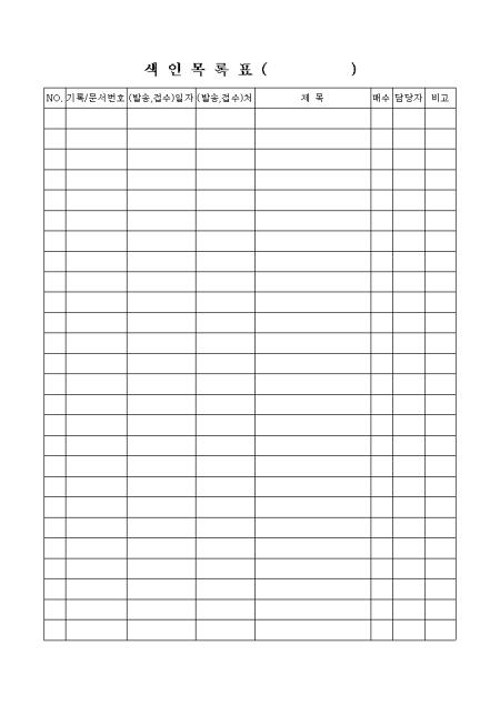 기록,문서번호,발송일자,발송처,제목을 기록하는 색인목록표입니다.