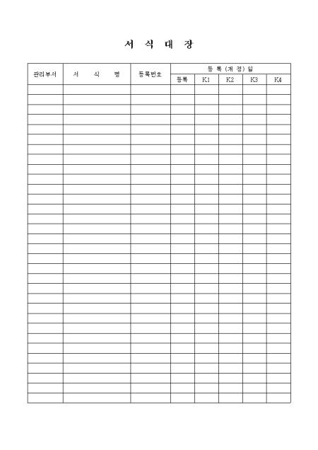 관리부서,서식명,등록번호,등록일을 기록하는 서식대장입니다.
