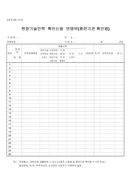 현장기술인력 확인신청 연명부(훈련기관 확인용)