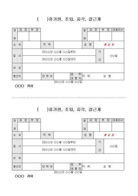 소속, 직위, 성명, 일시, 이유 등의 항목으로 구성된 조퇴, 지각, 결근계 양식입니다