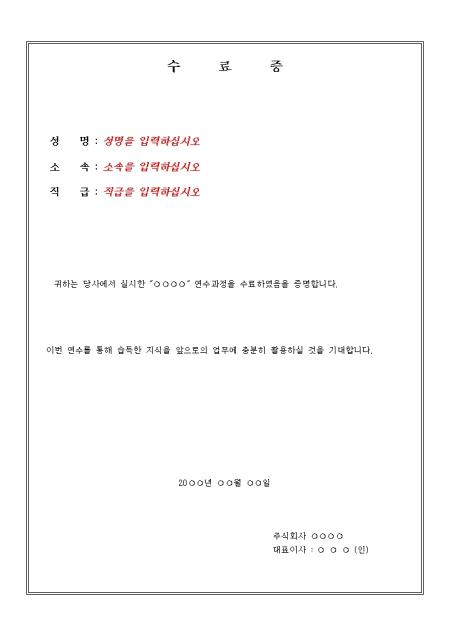 귀하는 당사에서 실시한 '○○○○' 연수과정을 수료하였음을 증명한다는 내용의 연수 수령증입니다