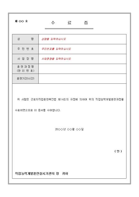 성명, 주민번호, 사업장명, 훈련과정명, 훈련기간 등의 항목으로 구성된 직업능력 개발훈련 수료증 양식입니다