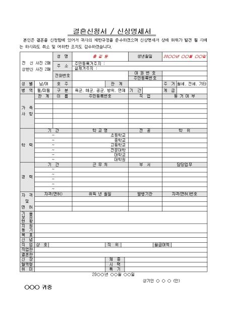 결혼을 신청함에 있어서 귀사의 제반규정을 준수하겠으며 신상명세서 상에 허위가 발견 될 시에는 하시라도 취소 및 여하한 조치도 감수하겠다는 내용의 결혼신청서에 포함되는 신상명세서 양식입니다
