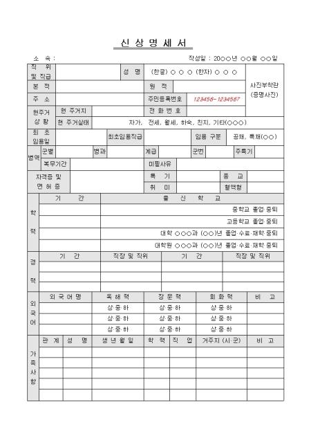 직위 및 직급, 성명, 본적, 원적, 주소, 현주거상황 등의 항목으로 구성된 신상명세서 양식입니다