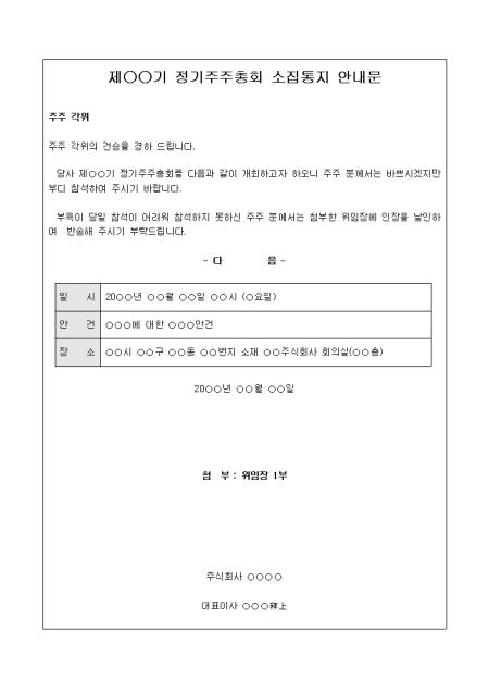 당사 제○○기 정기주주총회를 다음과 같이 개최하고자 하오니 주주 분께서는 바쁘시겠지만 부디 참석하여 주시기 바랍니다 라는 내용의 주주총회 안내문 양식입니다