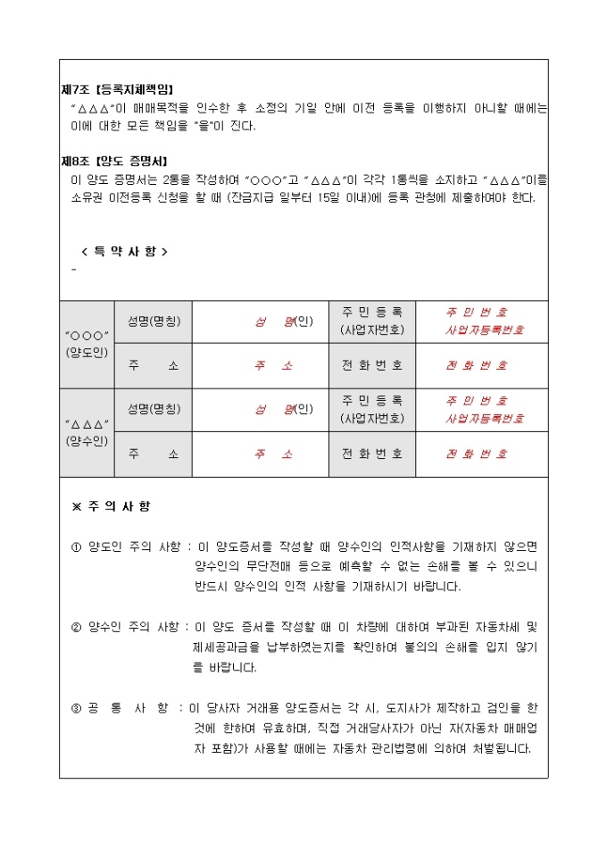 9,000원/월차량등록번호, 차종 및 차명, 매매일자, 매매금액 등의 항목으로 구성되어 8개조항으로 나누어진 당사자 거래용 양도증명서 양식입니다