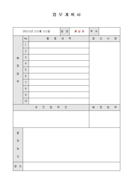 담당, 부서, 예정업무, 활동내역, 참고사항 등의 항목으로 구성된 업무계획서 양식입니다