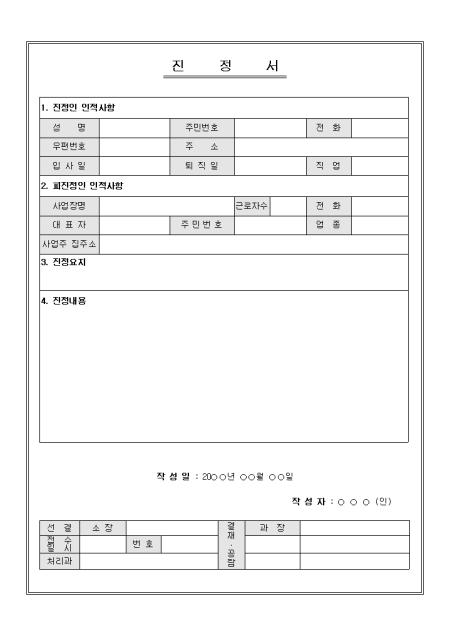 진정인 인적사항, 피진정인 인적사항, 진정요인 등의 항목으로 구성된 진정서 양식입니다