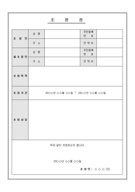 초청인, 피초청인, 초청목적, 초청기간 등의 항목으로 구성된 초청장 양식입니다