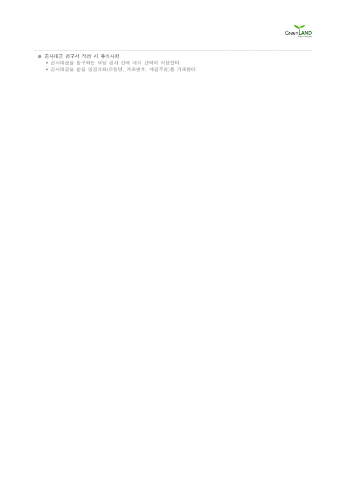 9,000원/월해당 서식은 중소기업의 현장,실무서식을 바탕으로 최적화된 부서별 표준서식입니다. 샘플내용, 작성방법, 관련규정 등 문서 하나에 모든 내용이 포함되어 있어 신입사원부터 사장님까지 누구나 쉽고 편리하게 사용할 수 있습니다. 우리회사만의 로고삽입이 가능하며 통일화된 양식으로 문서체계를 확립할 수 있습니다. 문서의 성격과 용도에 맞게 가장 안정적인 문서레이아웃으로 구성되어 있어 대내외용 문서로 활용도가 높습니다. 표준 공사대금 청구서 (작성방법 포함) ▶ 주요항목 : 공사명, 청구금액, 임금계좌정보(은행명, 계좌번호, 예금주명) 등 ▶ 작성방법 및 서식활용TIP : 공사대금을 청구하는 해당 공사 건에 대해 간략히 작성하고, 공사대금을 받을 임금계좌(은행명, 계좌번호, 예금주명)를 기재합니다.