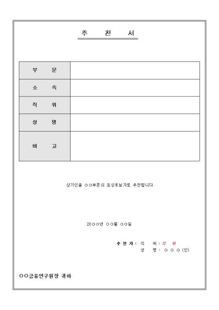 부문, 소속, 직위, 성명 등의 항목으로 구성된 포상후보자 추천서 양식입니다