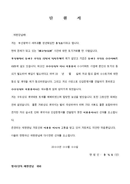구두로 약속한 매지를 약속대로 매도하였고 피해가 없었으므로 피고인을 선처해달라는 내용의 탄원서입니다
