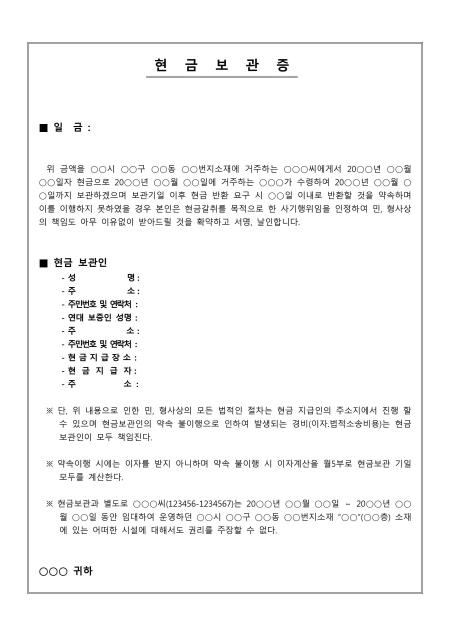 성명, 주소, 주민등록번호, 연락처, 연대보증인 성명, 현금지급장소 등의 항목으로 구성된 현금보관증입니다