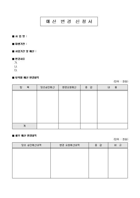 실행 사업의 예산 변경 신청 시 사용할 수 있는 예산 변경 신청서입니다. 사업명, 대행기관, 사업기간 및 예산, 변경사유 등의 항목으로 구성되어있습니다.