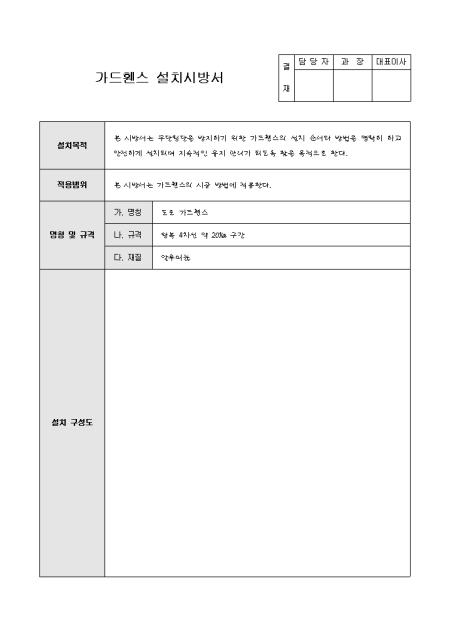 가드휀스에 대한 시방서입니다. 가드휀스의 설치목적, 적용범위, 명칭 및 규격, 설치구성도 등을 작성할 수 있는 가드휀스 설치시방서입니다.