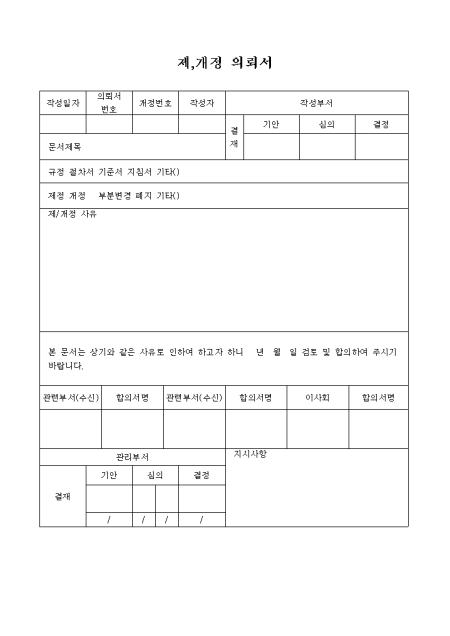 제,개정사유를 기록하는 문서 제,개정 의뢰서입니다.