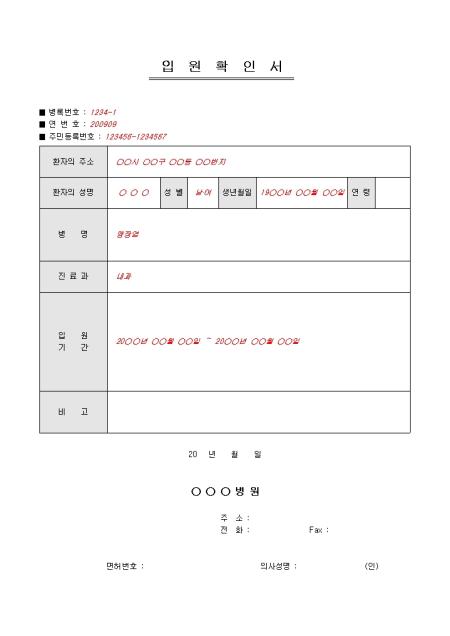 병원에 입원한 사실을 입증하고 확인할 수 있는 입원확인서입니다. 환자의 주소, 환자의 성명, 병명, 진료과 등의 항목으로 구성되어있습니다.
