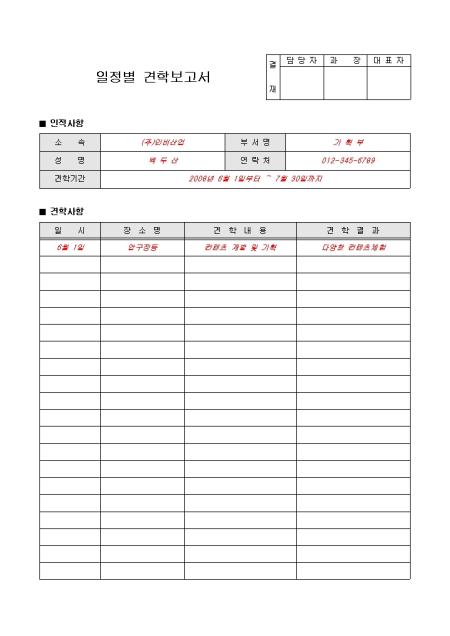 일정별로 작성이 가능한 견학보고서입니다. 견학자의 인적사항과 함께 자세한 견학사항을 작성할 수 있습니다. 간단한 샘플을 포함하고 있습니다.