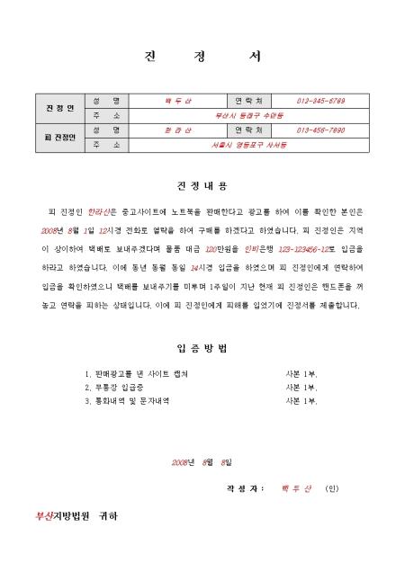 인터넷 거래관련으로 사기를 당한 진정인이 피진정인에 대하여 진정서를 작성하는 내용입니다. 인터넷 사기관련의 샘플내용이 작성되어있으며 진정내용 및 입증방법에 대한 샘플을 포함하고 있습니다.