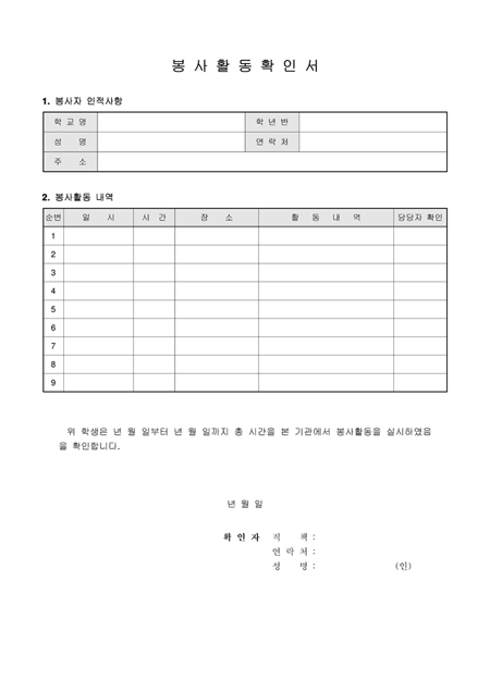 일별로 관리할 수 있는 봉사활동 확인서입니다. 봉사자의 인적사항과 활동내역을 작성하여 일별로 관리할 수 있도록 제작된 서식입니다. 간단한 샘플이 작성되어 있습니다.