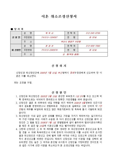 신청인은 피신청인과 이혼한다는 내용의 이혼 취소조정신청서입니다. 신청인과 피신청인의 인적사항과 신청취지 및 신청원인, 첨부서류 등을 작성할 수 있습니다. 간단한 샘플을 포함하고 있습니다.