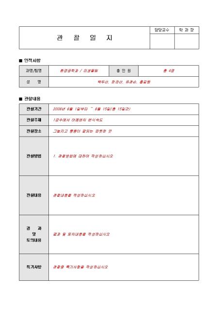 과별/팀별 주제별 관찰에 대하여 일지를 작성할 수 있는 서식입니다. 작성과/팀의 인적사항과 자세한 관찰내용을 작성할 수 있습니다. 간단한 샘플이 포함되어 있습니다.