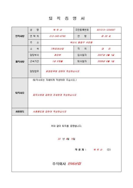 퇴직을 증명할 때 사용하는 서식입니다. 퇴직자의 인적사항과 재직사항, 퇴직사유 등을 작성하여 사용할 수 있습니다. 간단한 샘플이 포함되어 있습니다.